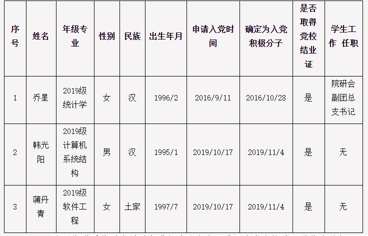 黄漫 党委关于确定乔星等3名同志为发展对象的公示经2019级研究生一党支部培养考察,在听取党小组、培养联系人、党员和群众意见的基础上,经党支部(或支委会)讨论,确定乔星等3位同志为发展对象。现...