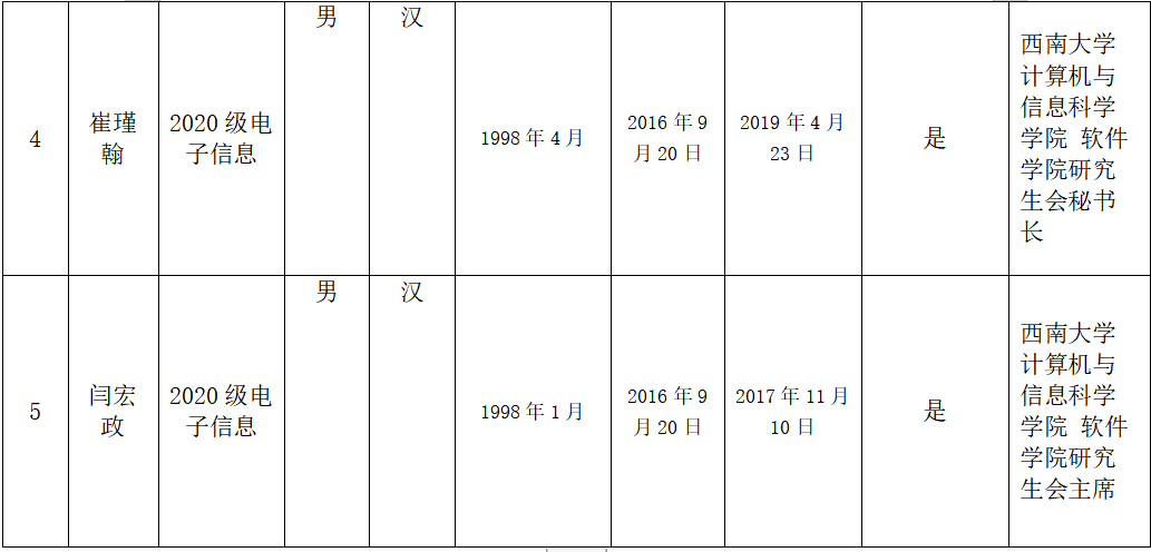 经黄漫 研究生四党支部培养考察,在听取党小组、培养联系人、党员和群众意见的基础上,经支委会讨论,确定罗欢等5名同志为发展对象。现根据学校发展对象备案制度进行公示,公示期为2021年4月21日-26日。如有意见,请在...