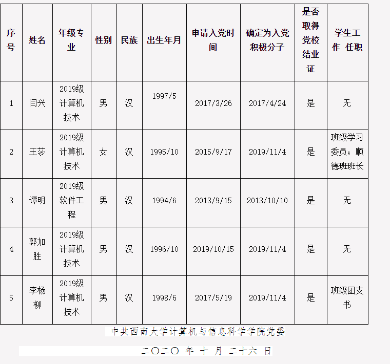 经2019级研究生二党支部培养考察,在听取党小组、培养联系人、党员和群众意见的基础上,经党支部(或支委会)讨论,确定闫兴等5位同志为发展对象。现根据学校发展对象备案制度进行公示,公示期为2020年10月26日-30日...