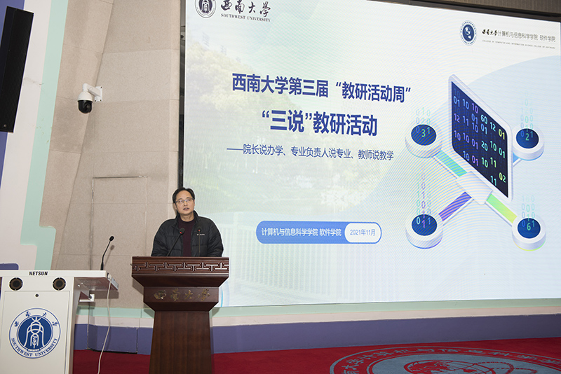 第三届“教研活动周”实施计划》等文件要求,我院于2021年11月19日下午14:30,在25教1楼报告厅召开全体教职工大会,围绕“院长说办学、专业负责人说专业、教师说教学”的主题开展了教育教学“三说”活动。活动由黄漫