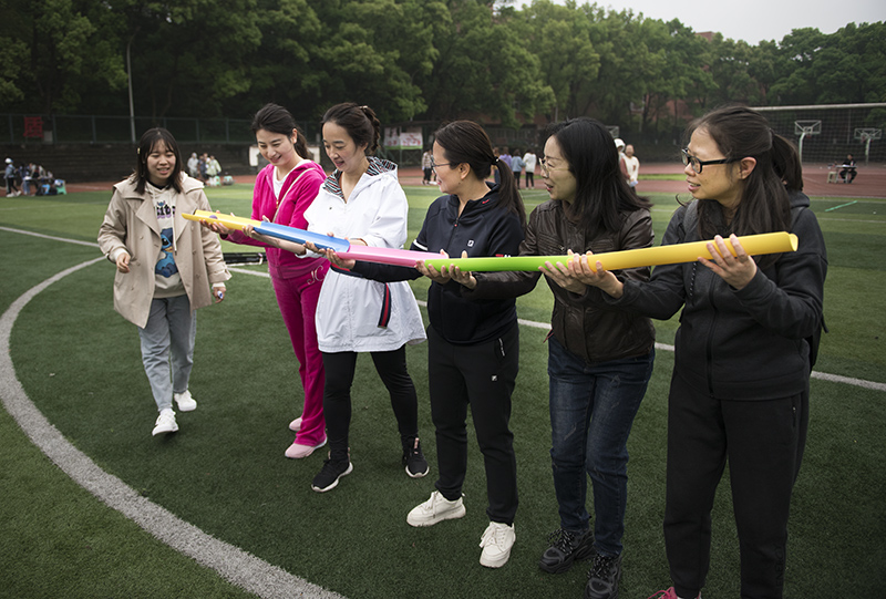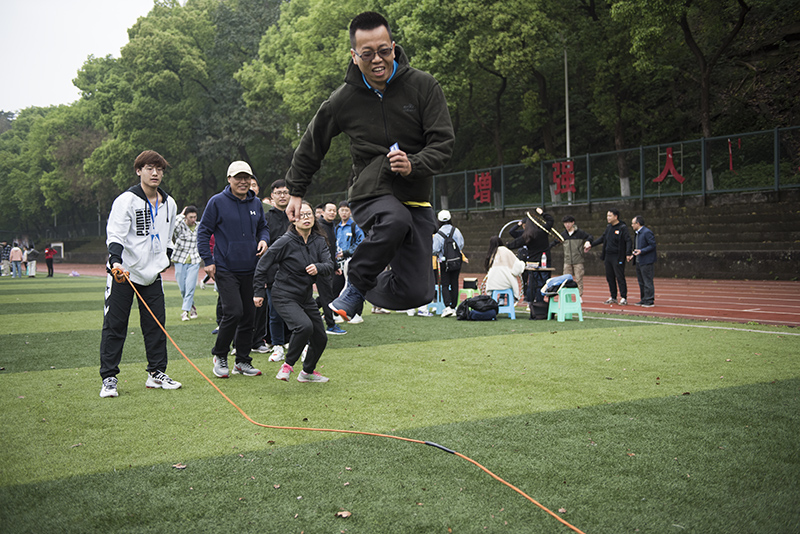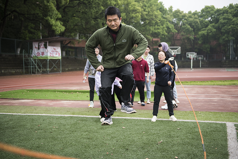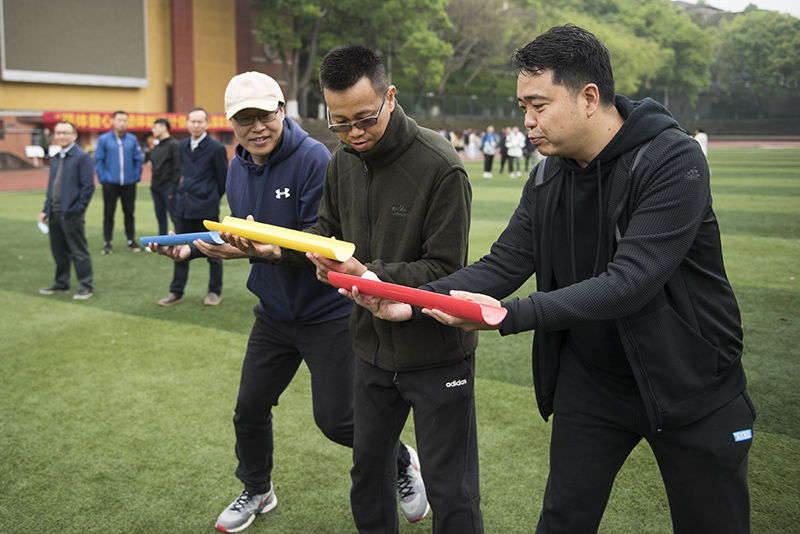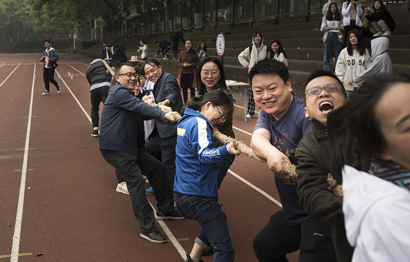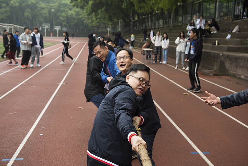 简短的开幕式结束后,各项比赛项目随之展开。“师生拔河赛”,教工队和学生队精神抖擞、蓄势待发,“加油!加油!”,在现场观众一声声加油助威的声浪中掀起了第一个高潮。比赛双方奋力向后拉着绳子。最终,经过双方激烈的比拼,教工队伍取得了胜利。