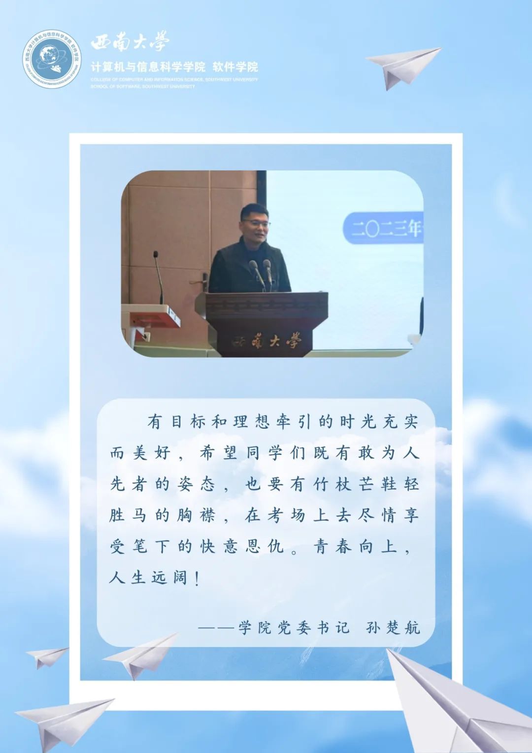 党委书记孙楚航、院长肖国强、党委副书记王晖、副院长廖剑伟、系主任代表邹佺、于显平,毕业年级辅导员谈沪东、唐瑞萱共同参与活动,为考研学子们打气加油。