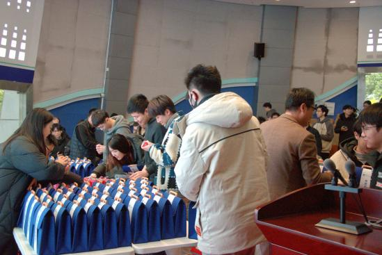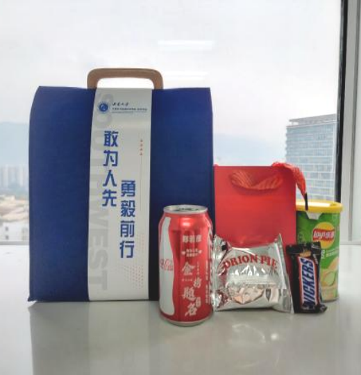 为同学们准备了贴心、实用的考研动能加油包,里面包含了能够帮助同学们缓解压力、增强信心和提供学习动力的小物品,比如美好寓意的胸章钥匙扣、提供能量的巧克力、拥有姓名的专属可乐以及惊喜满满的幸运刮刮卡等等。孙楚航书记和肖国强院长将“考研加油动能包”一一送到同学们手中,还叮嘱大家在考研最后阶段注意预防流感,健康作息,以最好的状态奔赴考场。