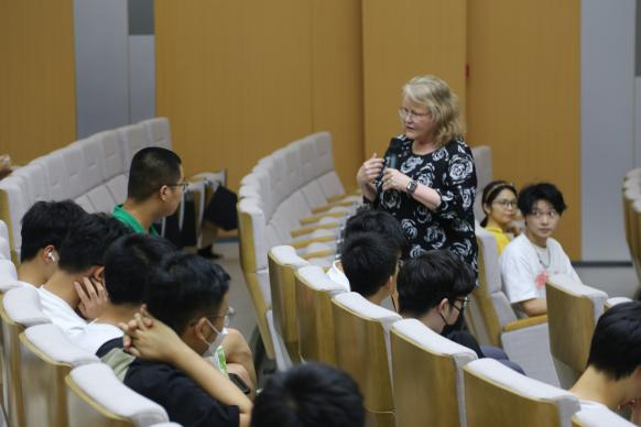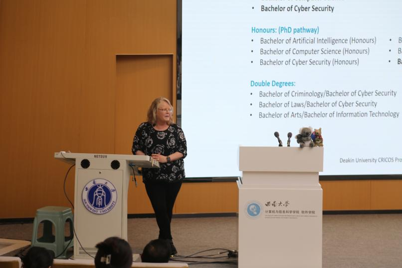 院长Trina Myers教授首先向同学们介绍了迪肯大学的生活环境、办学资源与优势、专业方向选择以及科研项目概况,表示非常欢迎同学们加入两校的合作办学项目。随后,迪肯大学信息技术黄漫
