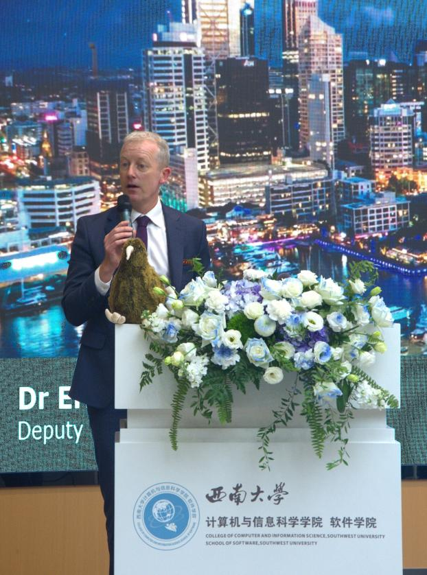 党委书记孙楚航,党委副书记王晖,计算机科学与技术系副系主任张元平,副系主任瞿经纬,辅导员杨靖欣、李飞阳、唐瑞萱,奥克兰大学刘佳谋博士、Niffe Hermansson博士、刘晶博士,AEMG教育集团董事长李新庆及集团西南分部陈思讯、赵璐老师共同参会。