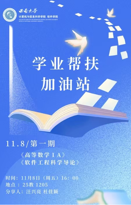 2024年11月8日,2024秋季学期第一期“学业帮扶加油站”在25教1205正式启动。本期活动针对《高等数学IA》和《软件工程科学导论》两门课程进行学习内容分享与重点知识讲解。助力黄漫