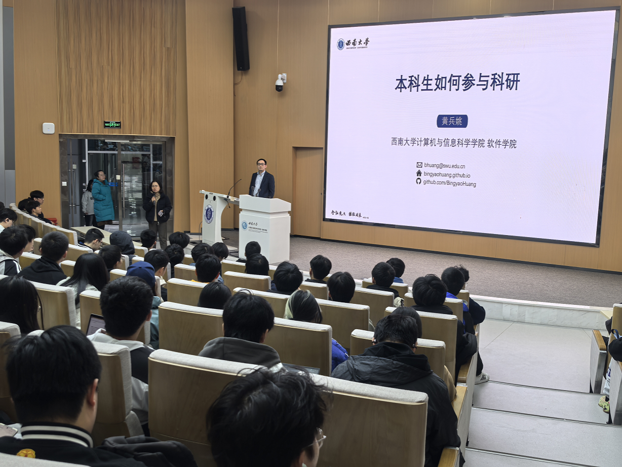 黄兵姚老师从“科研是什么”“为什么参与科研”“如何参与科研”等方面进行讲解。他表示,科研体现的是探索未知、追求真理的精神;参与科研有助于学习新知识,掌握新技能,培养创新思维和解决问题的能力,了解前沿动态和发展趋势,拓宽学术视野。在谈及本科生如何参与科研时,黄老师特别提醒同学们要树立正确的科研伦理观,坚守学术诚信,坚决抵制学术造假行为。他鼓励大家以平和的心态面对科研过程中的挫折与失败,强调科研非一日之功,切忌急功近利,应秉持求真务实的态度,踏实走好每一步。