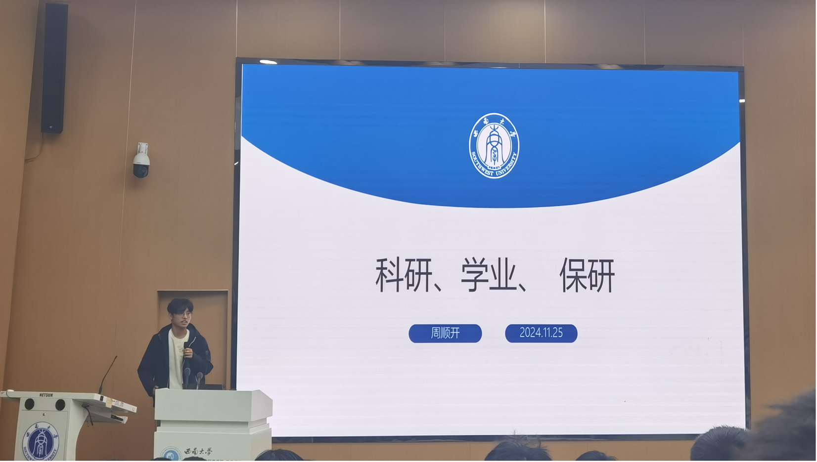 在科研经验分享环节,周顺开、刘佳城、邓清月三位高年级优秀同学结合自身经验,从参与项目经历、科研与学业的时间规划、专业学习方法等方面向同学们分享了科研道路上的探索与收获。他们鼓励同学们寻找自己感兴趣的科研方向,逐渐提升学术思维。他们的经验和心得让在场的同学们深受启发,收获满满。在讲座的互动环节,同学们热情高涨,纷纷举手提问,针对科研过程中遇到的困难和挑战,与黄老师和学长们进行了交流和探讨,现场气氛热烈而融洽。