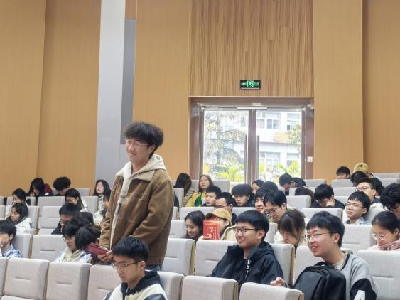 在互动环节,同学们踊跃提问。唐佳龙结合担任班干部的经历,分享了“以真诚换信任、以目标聚人心”的班级管理经验;马旭则针对“科研入门”“竞赛组队”等给出了中肯而实用的建议。同学们深受启发,现场气氛热烈掌声不断。