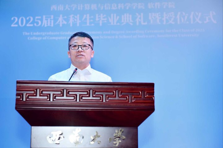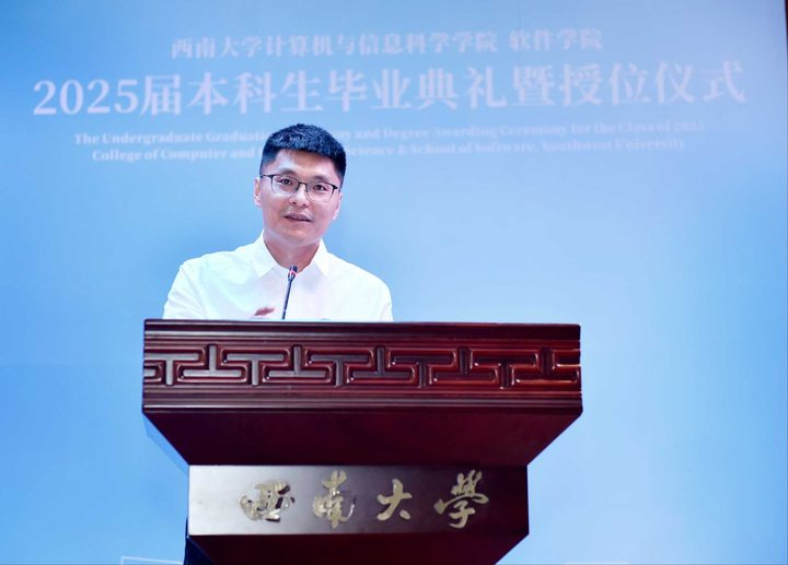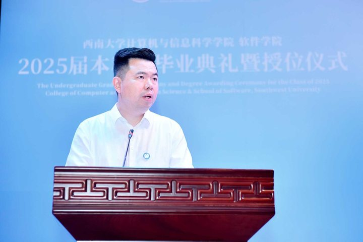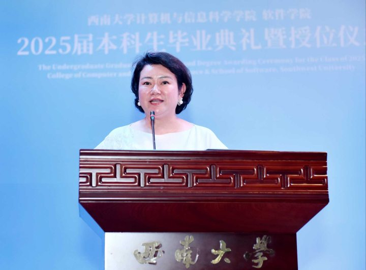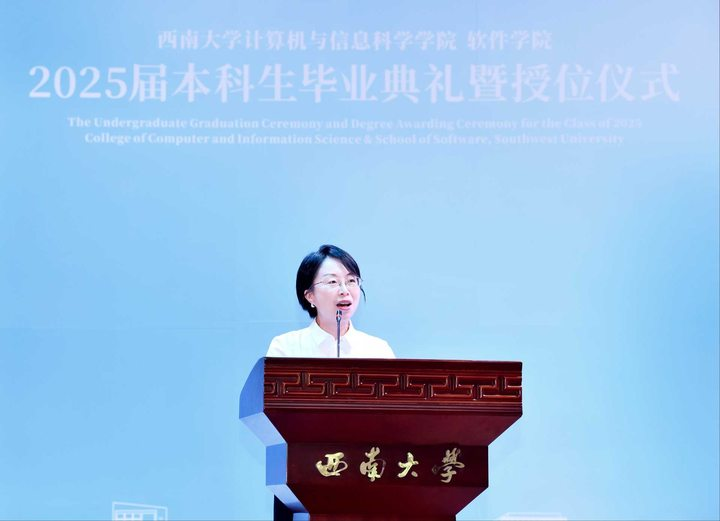 计算机科学与技术系主任王英老师代表教师为毕业生寄语。王英老师以三重身份与同学们话别。一是作为见证者:致敬同学们的奋斗成长。二是作为传承者:希望同学们交付火种,带着“技术匠心+人文温度”的DNA努力前行。三是作为守望者:希望同学们保持热情和动力,做“可持续”的奋斗者,拥抱丰富多彩的生活。