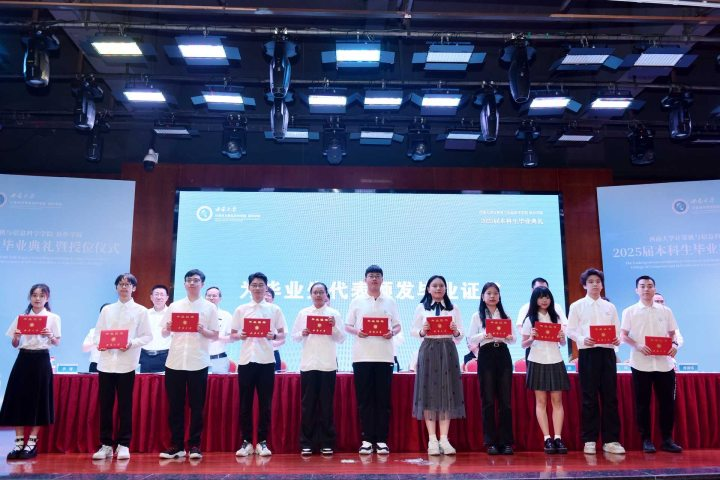 党委书记孙楚航宣读了表彰决定、毕业决定和授位决定。随后,主席台上的领导们共同为优秀毕业生代表颁发了荣誉证书,为毕业生代表颁发了毕业证书。证书封面烫金校徽熠熠生辉,象征着学子们的学术荣光;红色封皮映衬着青春面庞,定格了“学有所成”的珍贵瞬间。
