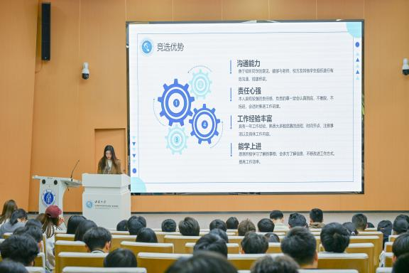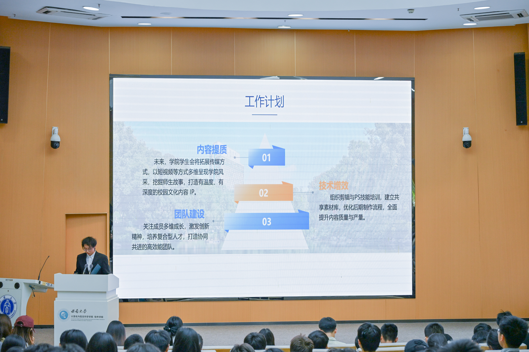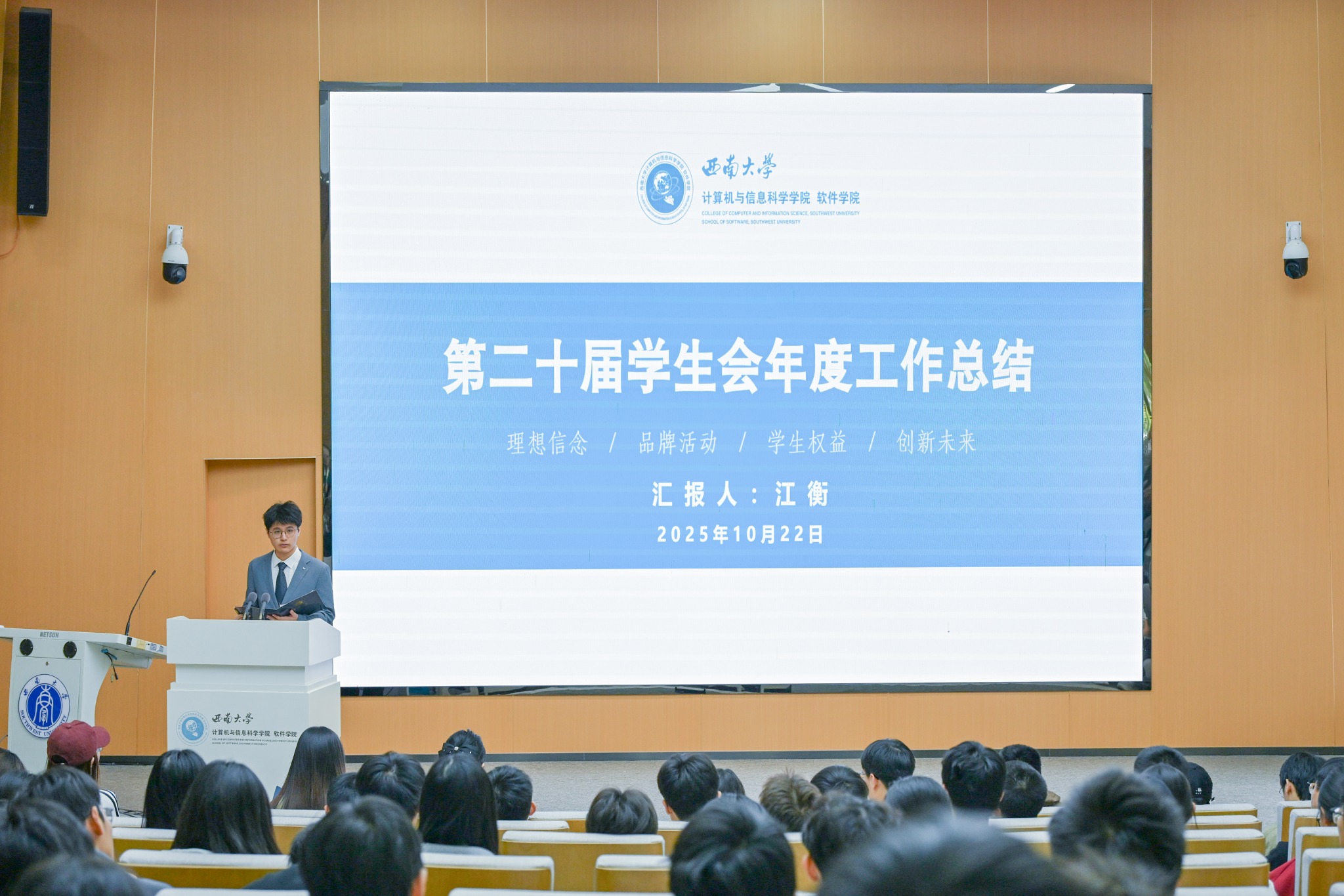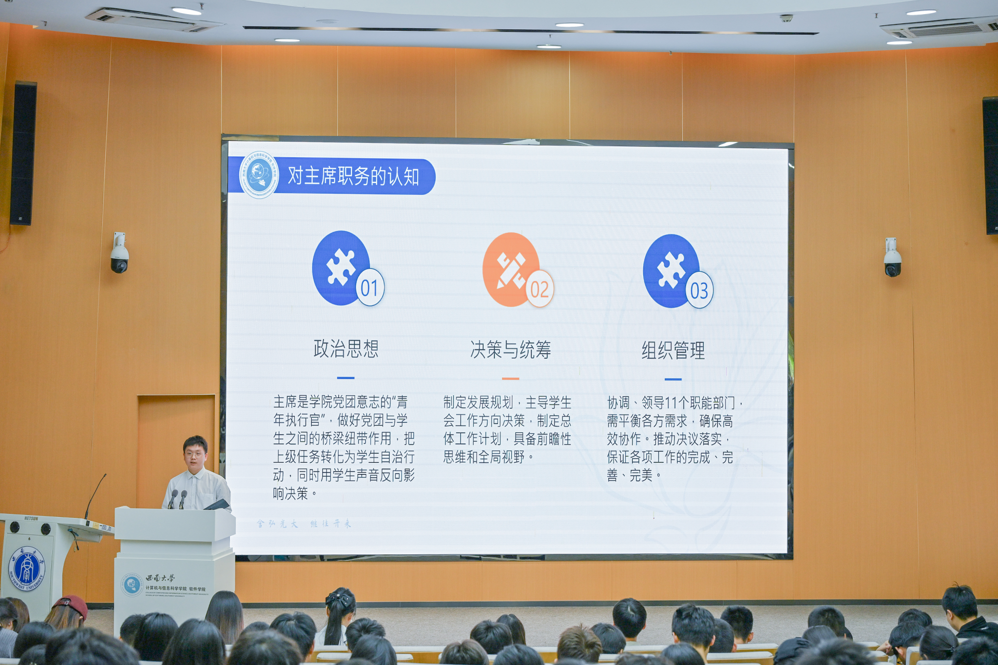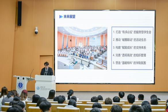 学生会主席团成员江衡作上一届学生会的工作报告,从理想信念、品牌活动、学生权益与学术科技等方面,回顾总结过去一年工作,提出深化改革、聚焦服务的未来工作建议,为学生会后续发展明确方向。