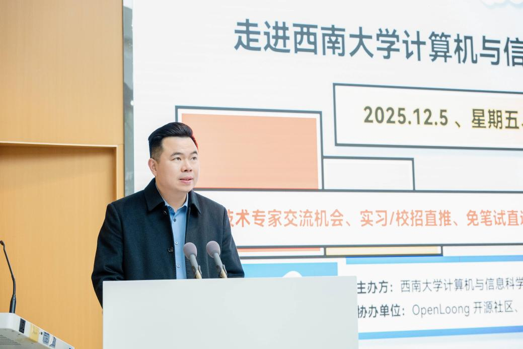 罗辛院长为活动开启致辞。他表示,“开源”与“AI”的深度融合,正成为加速创新、汇聚智慧的关键引擎。“源启高校”活动是一次难得的契机,可以让同学们近距离与行业精英交流,深入了解AI与开源技术的最新动态与实践经验。希望同学们能够珍惜机会,认真聆听,积极思考,踊跃互动,在交流中碰撞出思维的火花,在探讨中启迪未来的方向。