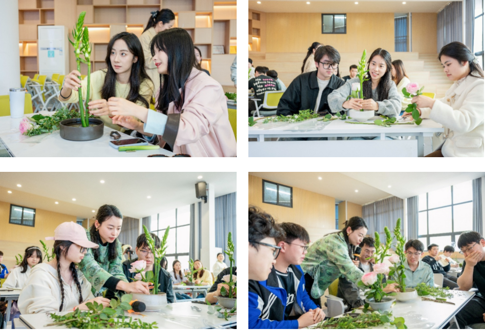 理论分享结束后,实操创作环节正式拉开帷幕。现场整齐摆放着各类新鲜花材、雅致花器与工具,春日的生机与中式的雅致扑面而来。同学们在苏苏老师的指导下,充分发挥创意与巧思,从选材、修剪、定枝到造型、搭配,每一个步骤都认真专注、精益求精。现场氛围温馨而热烈,大家互相交流创作思路、彼此启发灵感,在花草的芬芳中舒缓学业压力,在指尖的创作中释放心性,沉浸式感受中式插花的独特魅力。创作完成后,同学们纷纷与自己的花艺作品合影留念,将这份亲手打造的春日美好带回寝室,留住一整个春天的浪漫与温暖。