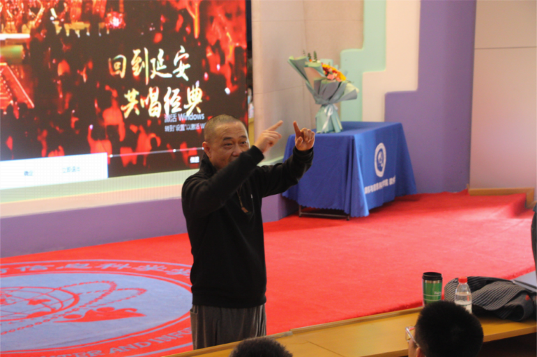 伴随着气势磅礴的《黄河船夫曲》开场,汪教授与同学们进行了幽默亲切的互动并介绍有关大合唱的知识。说到兴头,汪教授还即兴哼唱几句,与同学们分享对音乐的感悟,同学们也热情地回应汪教授。