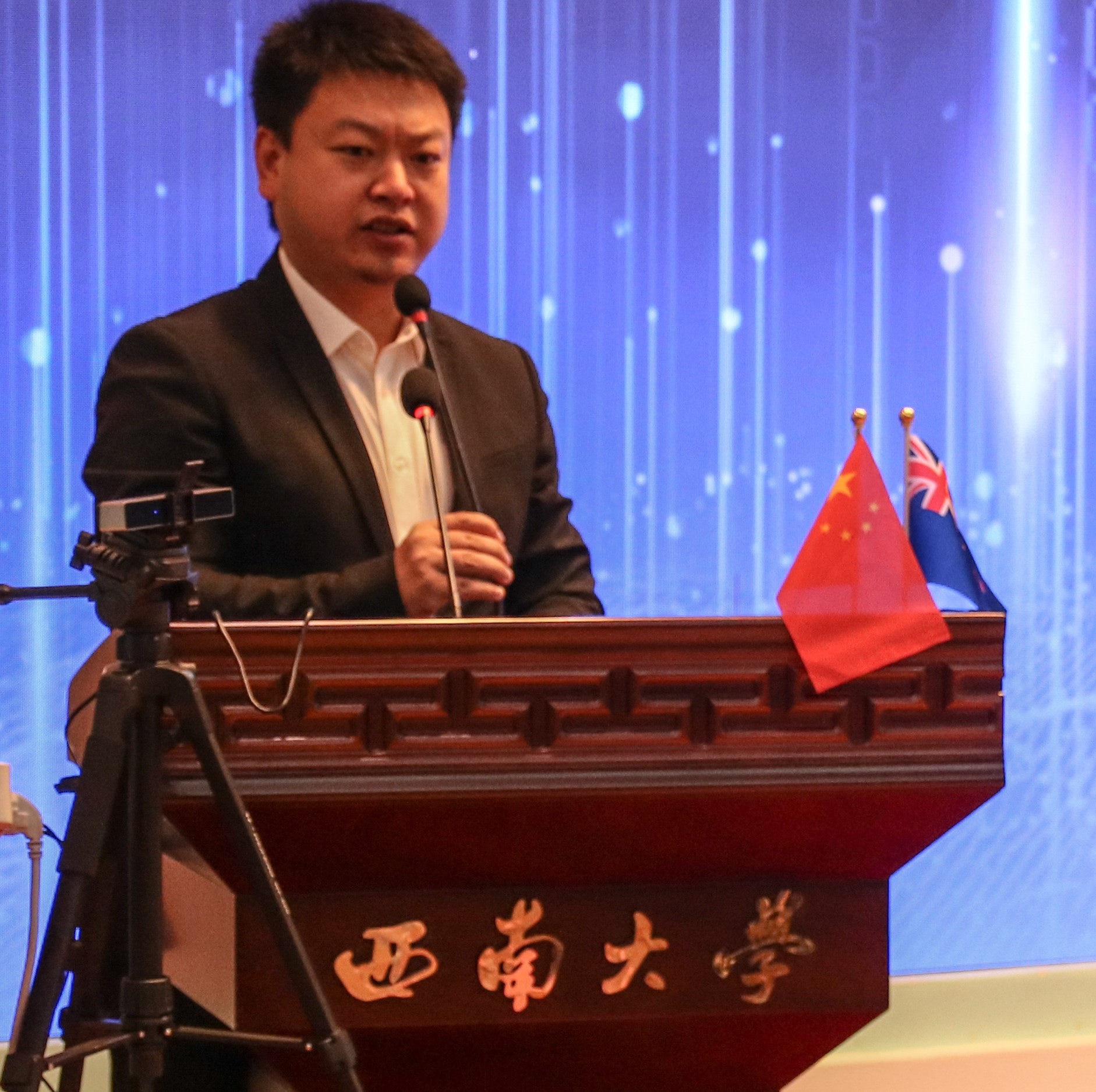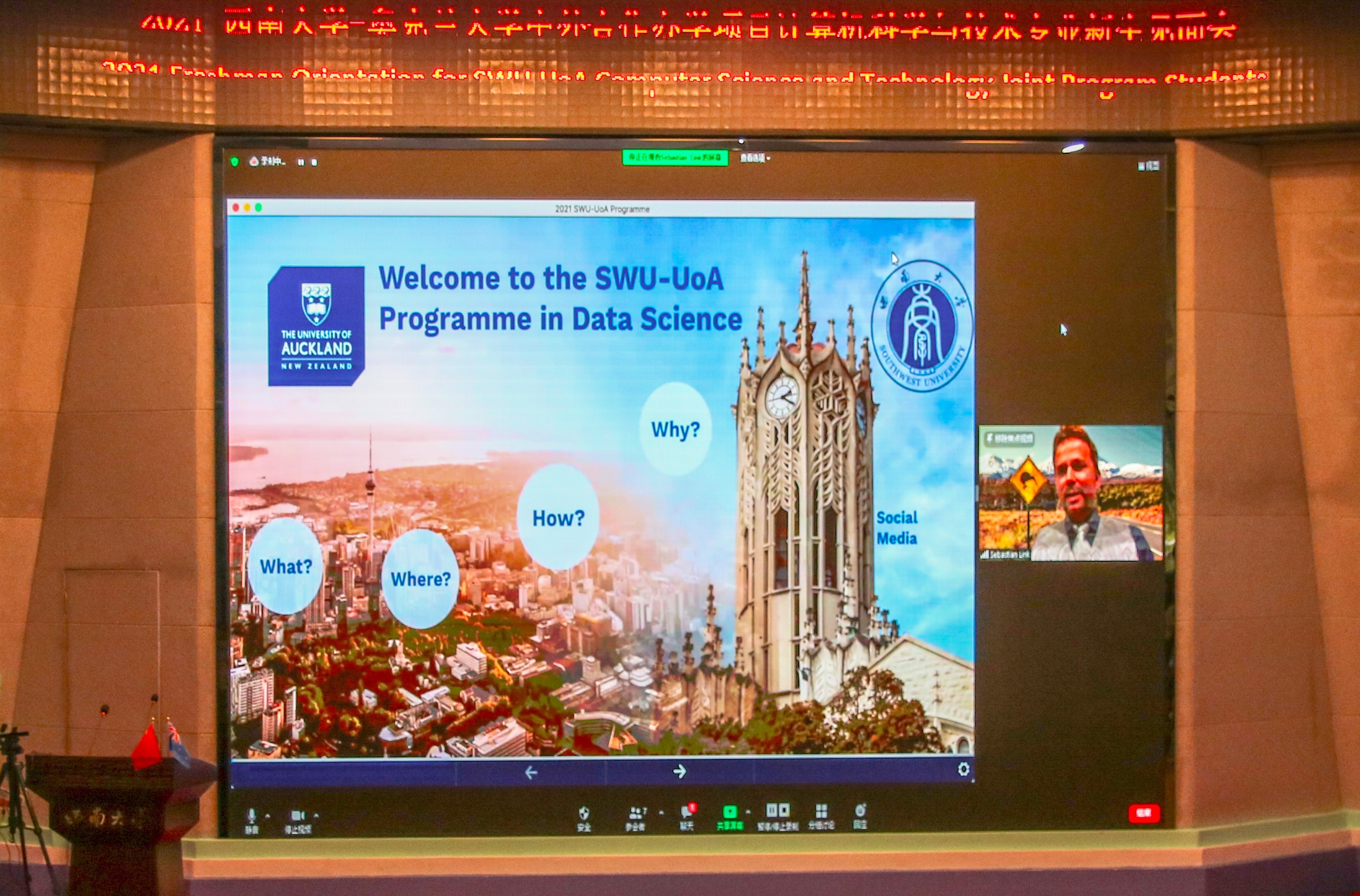 然后,播放了奥克兰大学校长道恩·弗雷什沃特教授的祝福视频;随后,奥克兰大学理学部副部长塞巴斯蒂安·林克教授从Where、What 、How、Why四个角度为大家详细介绍奥克兰大学和Data Science这门学科,比较了奥克兰大学在全球的优势,给同学们解释了中外合作办学3+2项目在西大和奥克兰大学课程的详细设置,介绍了学科领域顶尖专家,最后祝愿大家都能顺利到奥克兰大学深造。