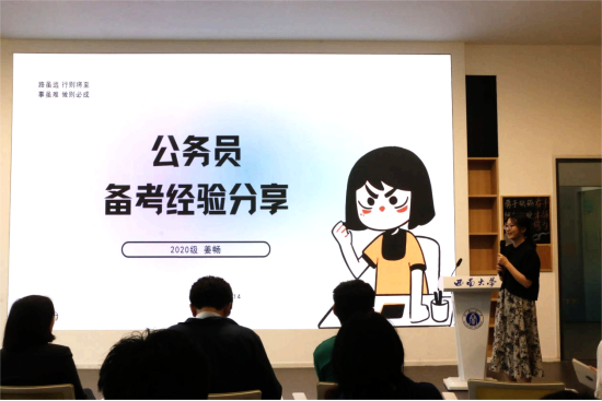 接着,2020级姜畅学姐分享了她考取公务员的经历。学姐先从公务员考试类别入手,列举了包括省考、国考在内的各个类别,并为同学们详细介绍各类型考试的区别以及备考重点。随后,姜畅学姐分享了她的备考资源库,希望同学们在考公复习的路途上少走弯路。