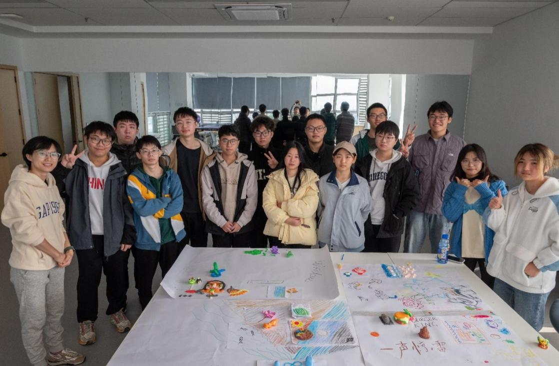 在小组合作环节。同学们齐聚在一张大纸旁,将各自对自我的认知融入到集体创作中,相互交流、相互启发,共同完成一幅作品。在这个过程中,同学们不仅进一步深化了对自己的认识,还学会了在团队中表达自我。活动中,同学们通过冯夏老师的引导,在轻松愉快的氛围中完成了对自我的深度探索,同时也在想象与自然的连接中感受到了自然的魅力。