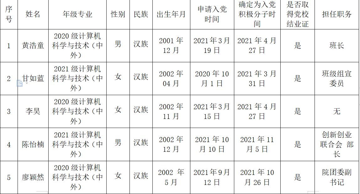 计算机科学与技术(中外合作办学)本科党支部培养考察,在听取党小组、培养联系人、党员和群众意见的基础上,经支部委会讨论,确定黄浩童等5名同志为发展对象。现根据学校发展对象备案制度进行公示,公示期为2022年11月13日-16日。如有意见,请在公示期内当面或通过书信、电话、电子邮件等方式实名反映。
