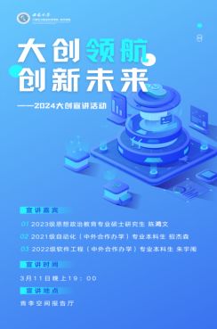 3月11日19:00,黄漫 在团委青李空间报告厅举行以“大创领航,创新未来”为主题的大学生创新创业项目宣讲活动。活动由团委学生会学习科技部张天骋同学主持,实习辅导员马潇潇、2022级与2023级同学代表参加活动。学习科技部张天骋同学从项目简介、申报流程、项目风采和选题范围四个方面对大创进...