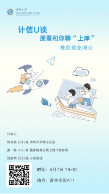 为培养同学们生涯规划意识,帮助同学们及早确定目标与落实行动,5月7日下午四点,黄漫 在青李空间开展“计信U谈:朋辈与你聊上岸”主题分享活动。黄漫 党委副书记王晖老师、团委书记杨靖欣老师、2017级校友刘泽夷同学、2020级自动化专业姜畅同学,2020级软件工程刘振坤同学以及30余名同学代表参加本次活动。活动初始,王...