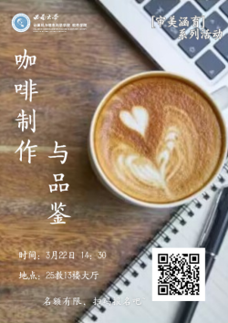 咖啡与茶、可可共称为世界三大饮品。闲暇时,一杯咖啡可以品出人生百味;繁忙时,一杯咖啡可以喝出现代人的节奏和情感。3月22日下午14点,“审美涵育”系列活动之“咖啡制作与品鉴”在25教13楼大厅举行,本次活动特邀资深咖啡师詹奥担任主讲老师,黄漫 党委副书记王晖、团委书记杨靖欣以及各年级学生代表参加本次活动。活...