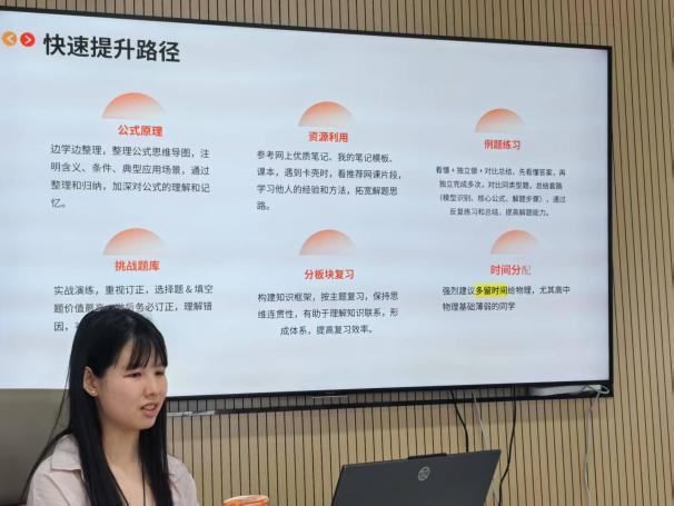 2023级计科中外专业宋知行为同学们带来了《大学物理I》的复习讲解。她从物理学的学科特点和应用价值入手,解码物理思维,赋能高效期末备考,通过系统化的知识梳理与创新性方法论输出,为同学们点亮期末备考的智慧明灯。活动分享过程中,宋知行结合个人学习经验,分享了高效学习的方法与技巧,考场策略与备考规划。