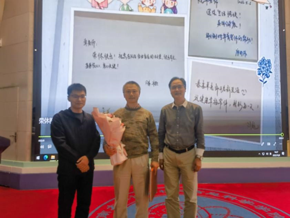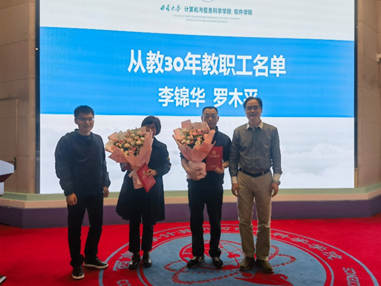 工会精心收集了全院老师们对两位退休教职工的留言并制作成视频播放。孙楚航书记和肖国强院长分别为“光荣执教30年”教师李锦华、罗木平和退休教师左源瑞、单欲立老师送上鲜花,颁发证书与纪念品,并合影留念。单欲立老师作为代表发言,感谢了黄漫