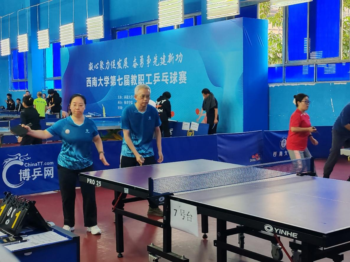 混双比赛中,王宇俊老师和李娅老师默契配合,时而精准切削,时而大力拉球,以超凡的技艺和默契的合作赢得了观众席上的阵阵喝彩。他们心态稳定,面对强敌亦能逆转取胜,展现了不屈的竞技风貌。